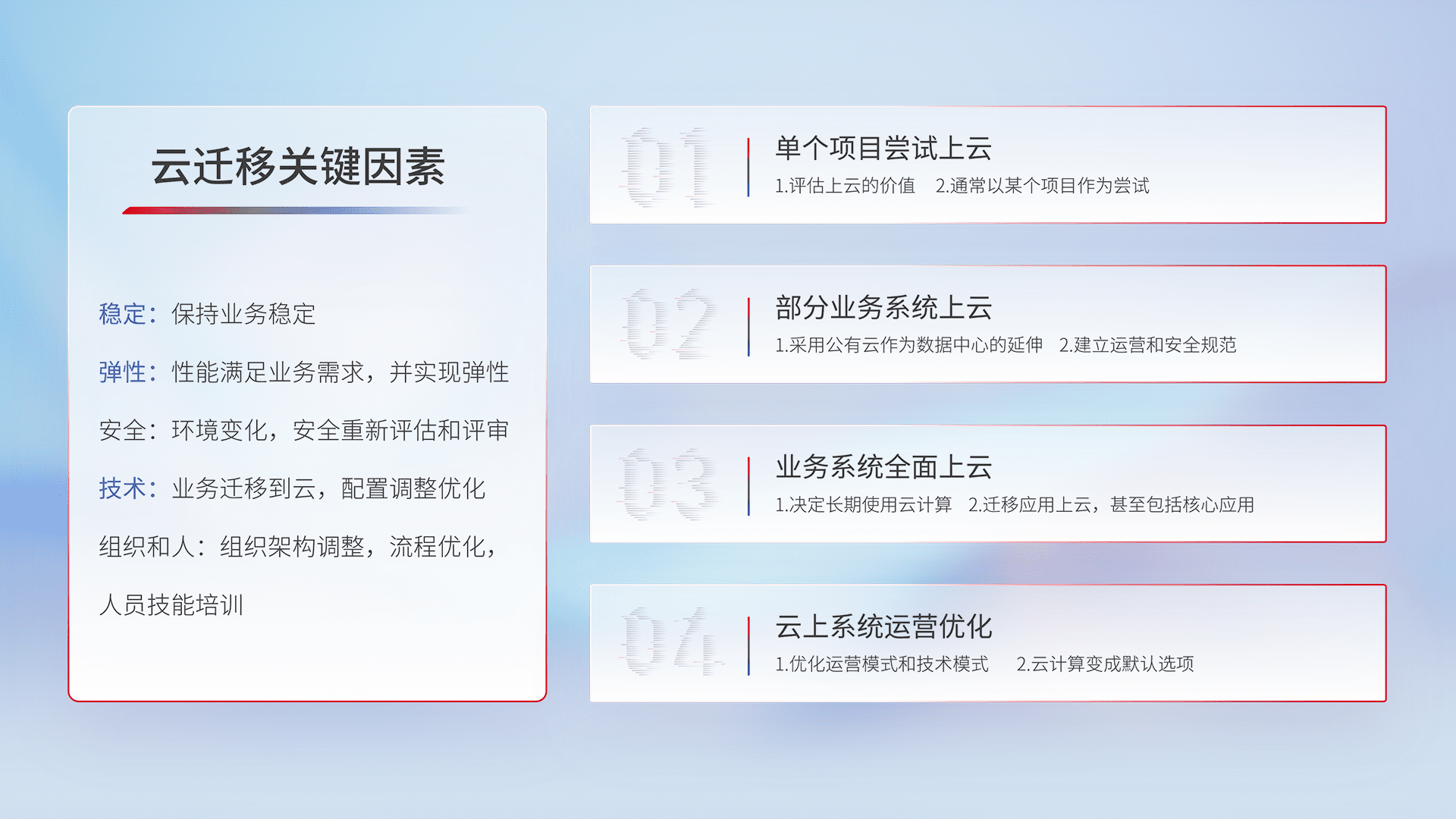 结合实际业务,,,,从规划设计、、云平台选型、、、、云原生改造、、数据迁移、、、集成交付,,迁移全过程为客户识别最佳上云路径,,,,做好风险识别管理,,,设计网络架构、、、、身份权限、、、、安全审计合规、、、操作审计、、、、日志审计、、监控告警策略、、、、多站点容灾设计等,,对云上基础设施进行整体规划,,,提升IT治理水平,,,,以满足弹性、、、高可用、、、、高性能的需求。。