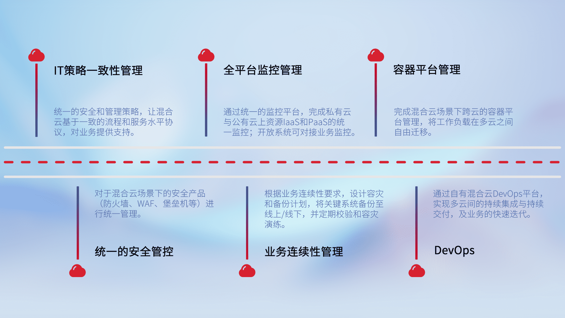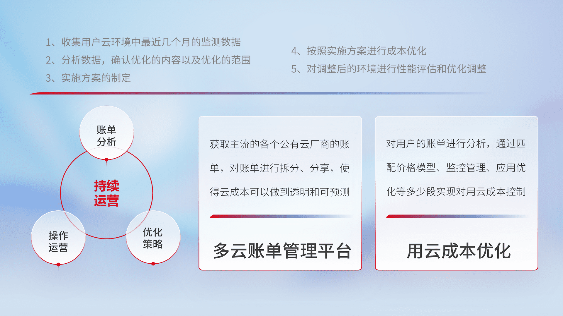 通过多云纳管,,,以统一的资源数据模型把客户的云资源进行抽象和封装,,进而实现对多云资源的统一操作,,,保障云资源管理的可靠性、、稳定性与可用性。。量身定制化运维内容,,,配置、、开发运维、、补丁管理、、、备份、、、监控、、、、认证和访问管理、、审计和日常巡检等,,,,保障在用云过程中的可靠度,,,稳定度以及高可用率。。